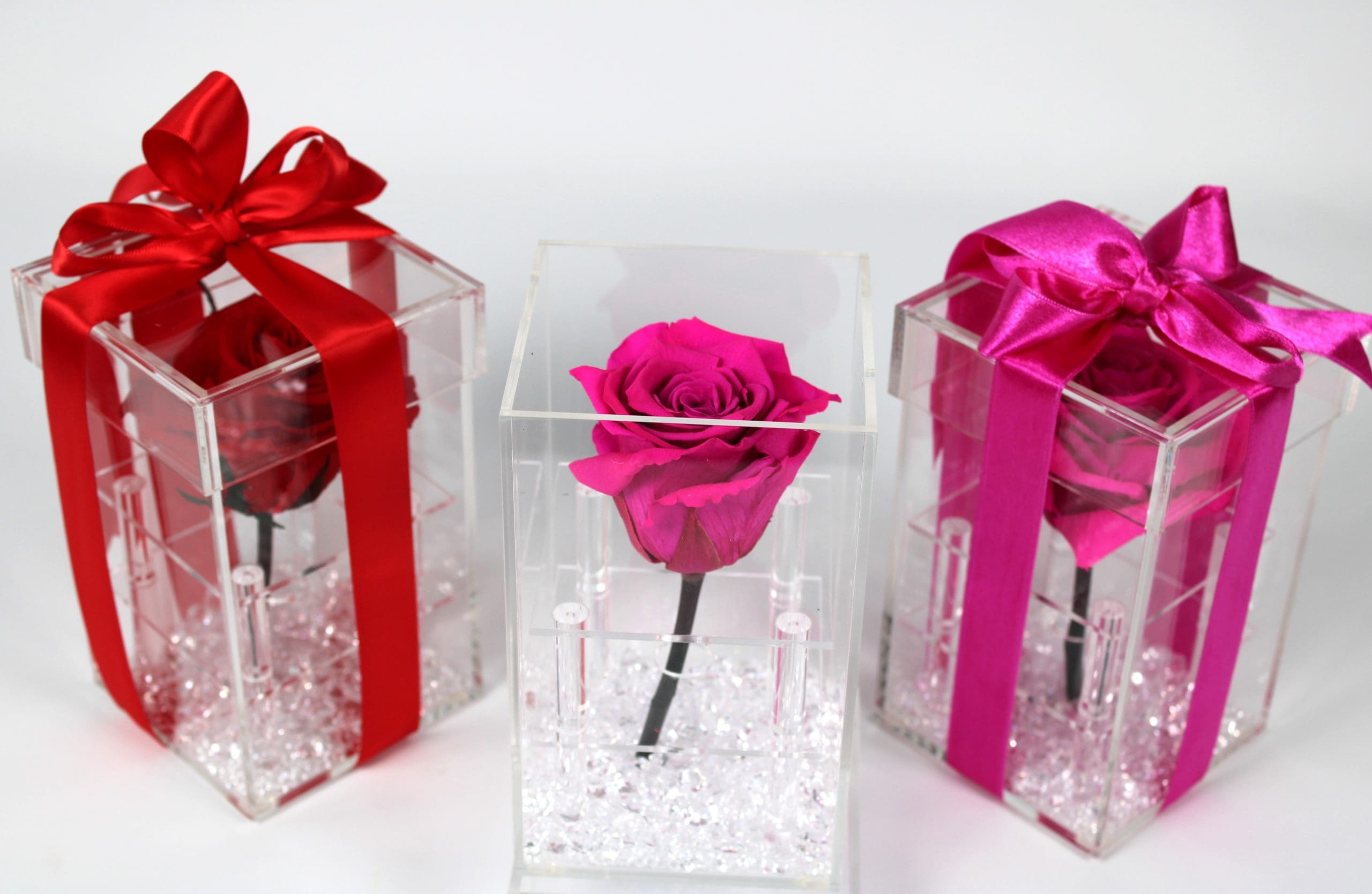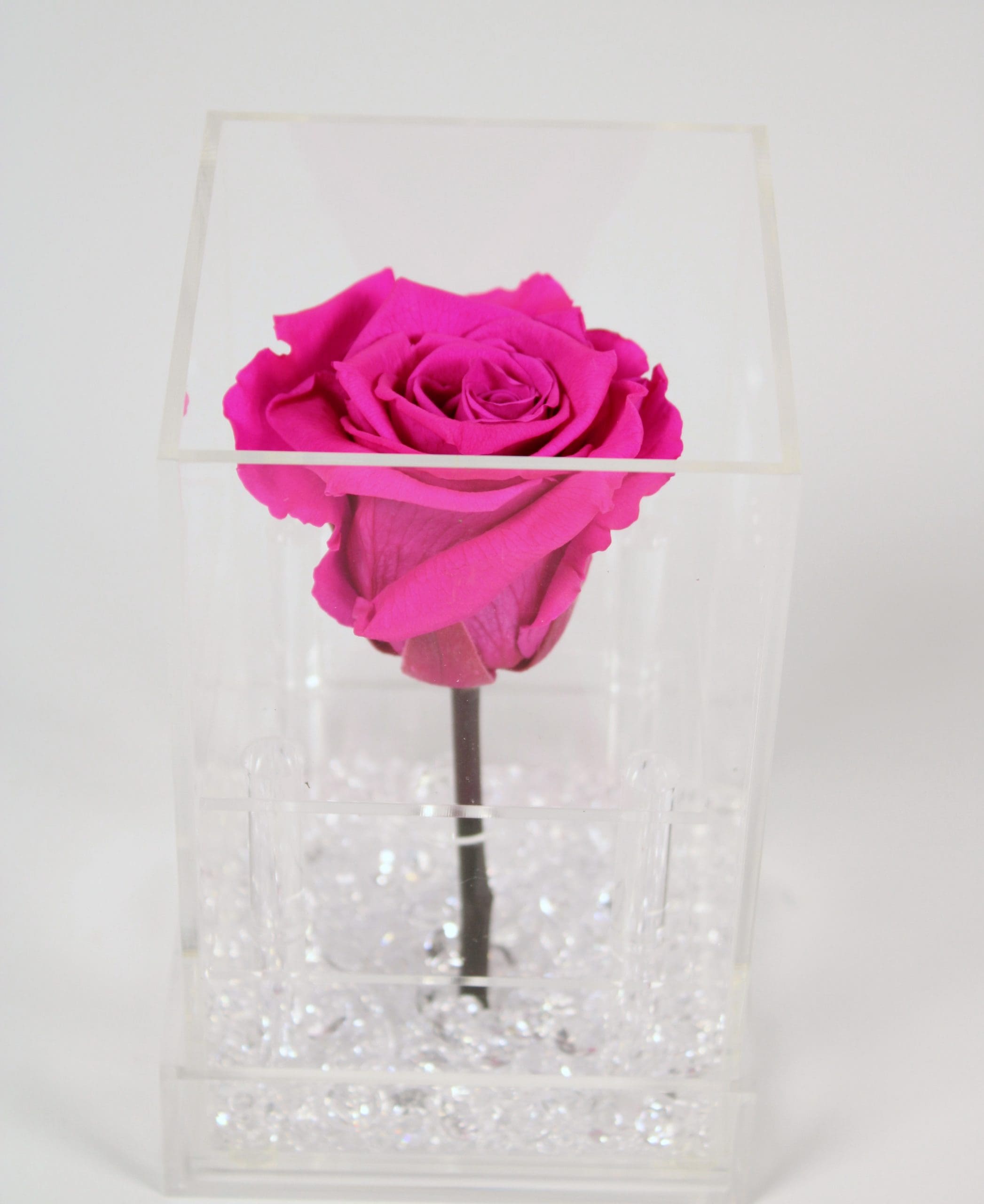 Add a sparkle of magic with this stunning single rose in your choice of colour. Presented in a clear acrylic box with matching ribbon.