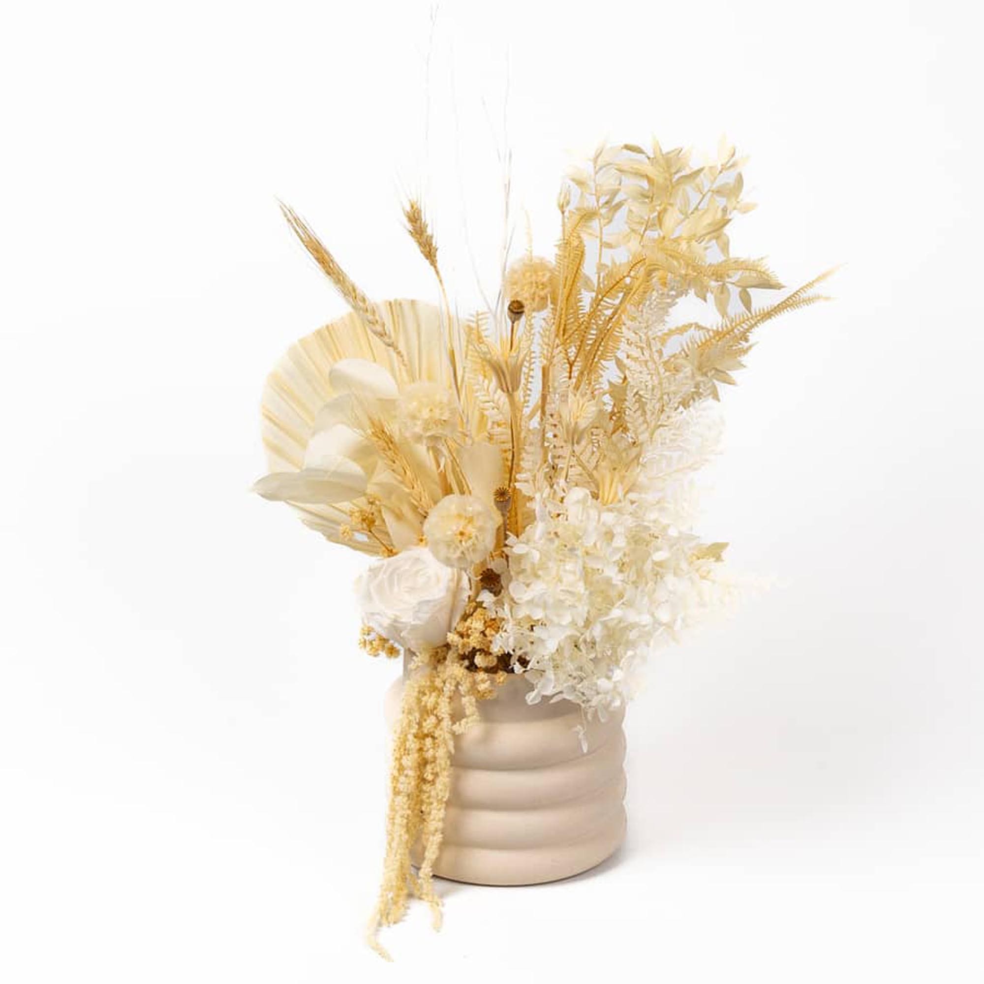 This stunning display of natural died flowers have been carefully chosen to complement any decor. With it’s soft cream tones, this floral arrangement exudes a sense of style and inviting ambiance. Perfect for any gift or occasion.