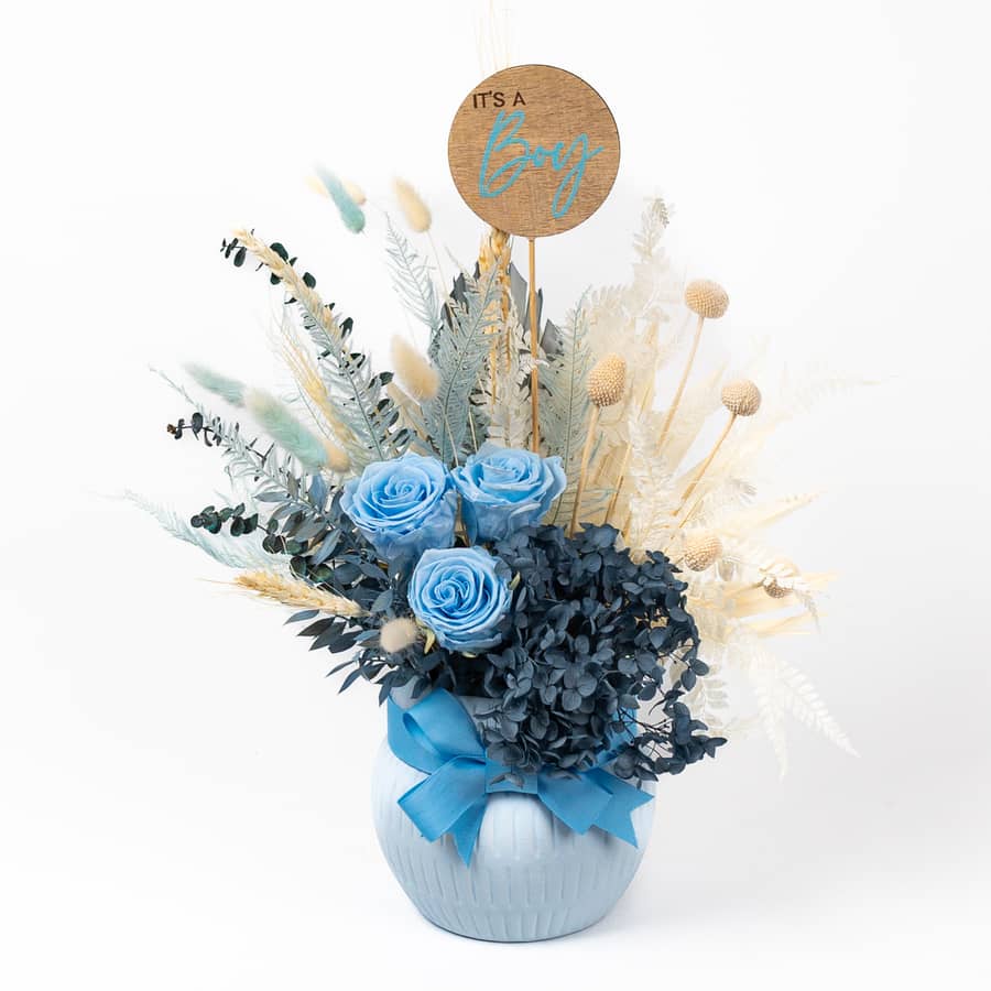 Say congratulations with this beautiful floral arrangement with soft blue and natural tones along with 3 gorgeous blue long lasting roses.