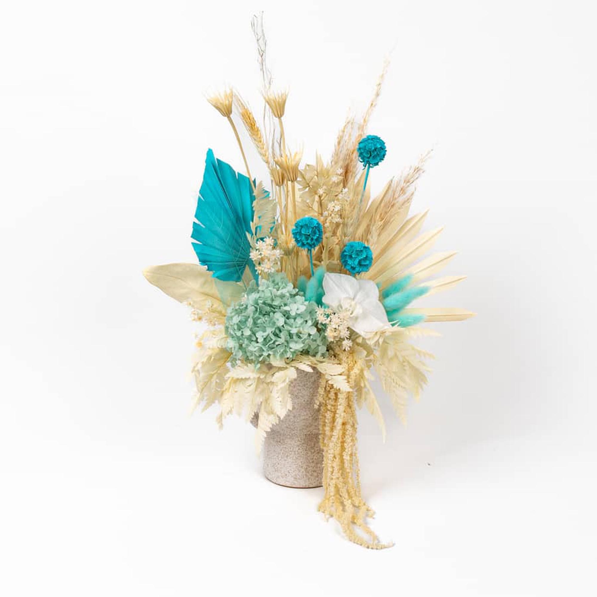 This gorgeous dried floral arrangement is set off by the vibrant turquoise and natural cream highlights, which add a pop of colour to the overall design.   The centrepiece is a stunning white preserved orchid perfectly complementing the surrounding flowers and is sure to impress anyone who receives it.
